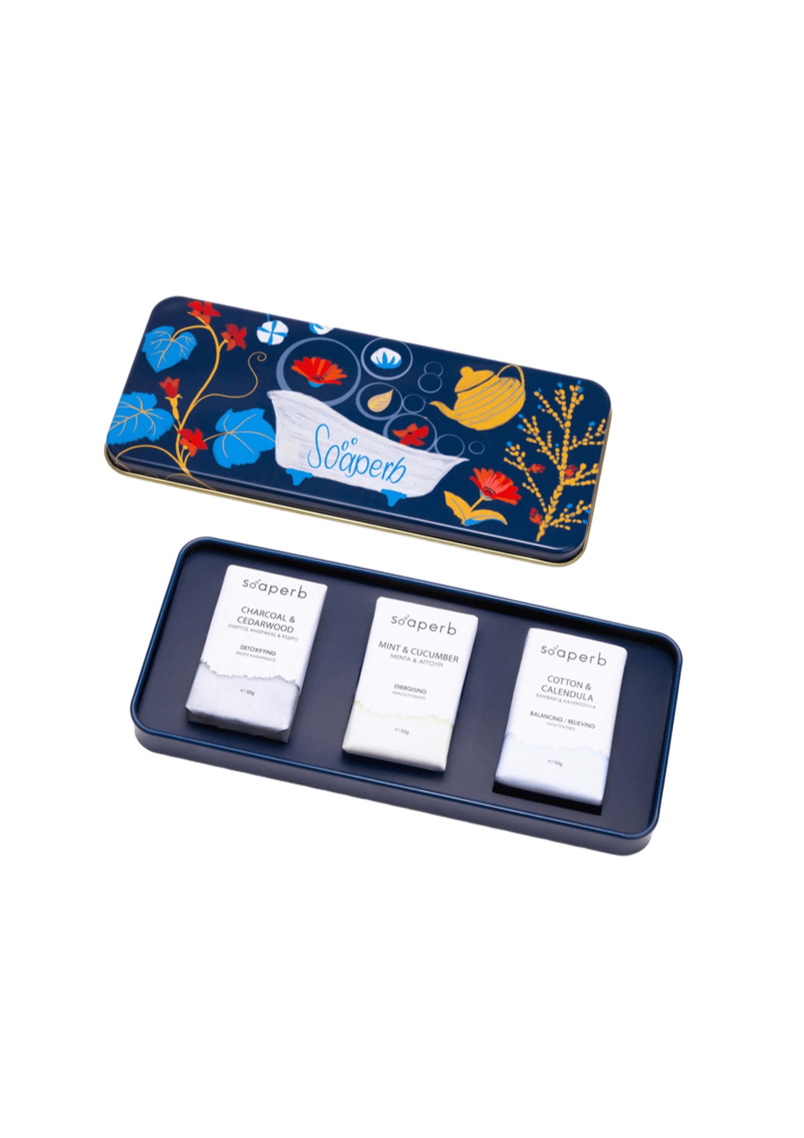 3 bestseller σαπούνια προσώπου SOAPERB σε μια όμορφη μεταλλική συσκευασία. Ιδανική για δώρο, ταξίδι, ή μια εκπληκτική εμπειρία φυσικής περιποίησης με πραγματικά αποτελέσματα.